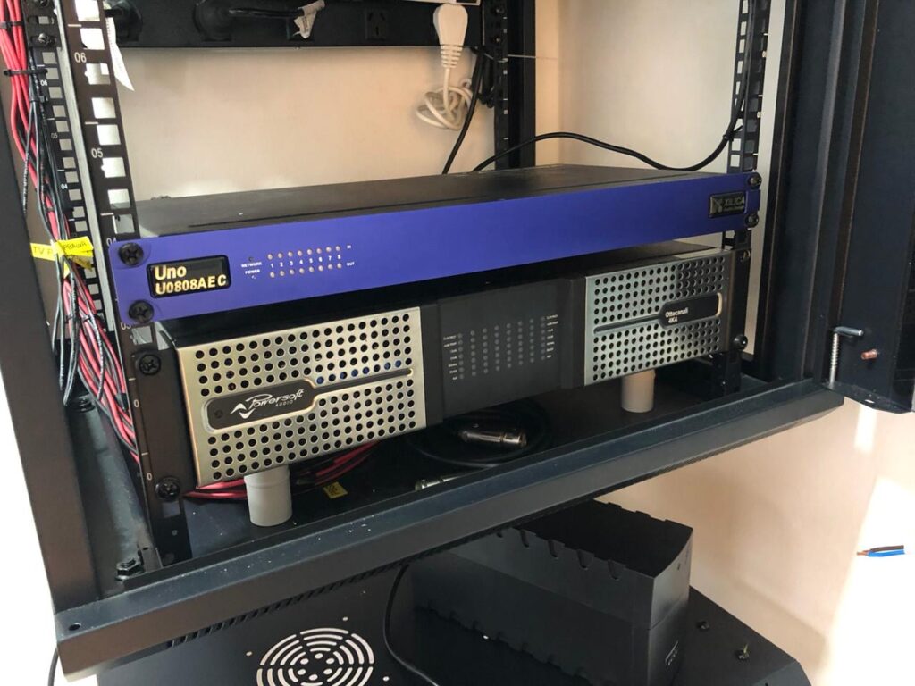 Se colocaron tres mikra4 amplificados por un canal de la Powersoft Ottocanali 4K4. El proceso se realiza con el Xilica UNO U0808.