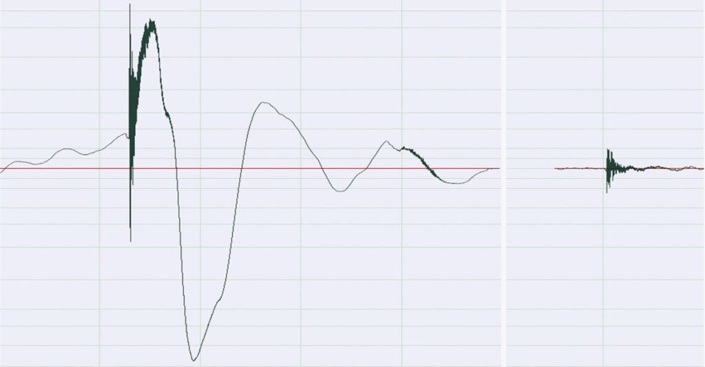 La figura 2 muestra cómo pueden verse estos impulsos al hacer esto en dos micrófonos diferentes: un 4011A (micrófono de lápiz para usar con soporte) y un 2028 (micrófono de mano).