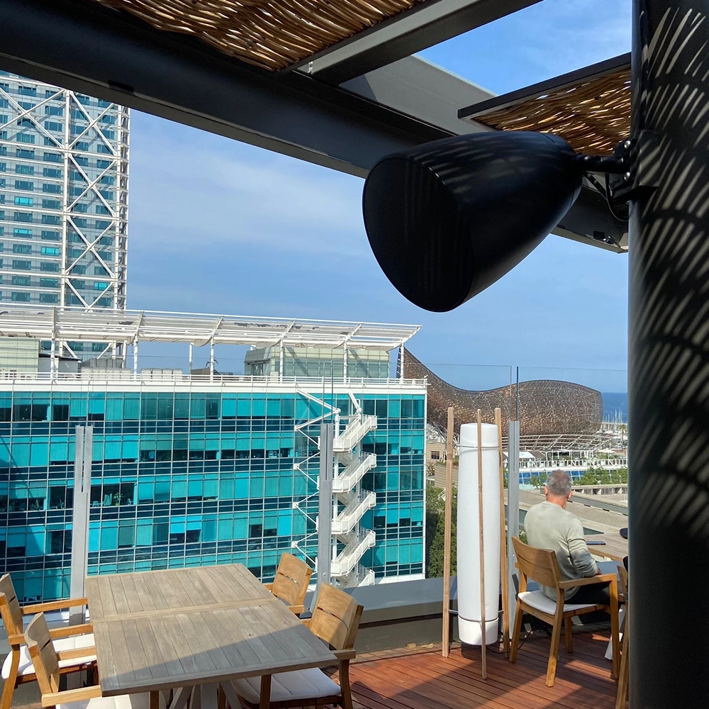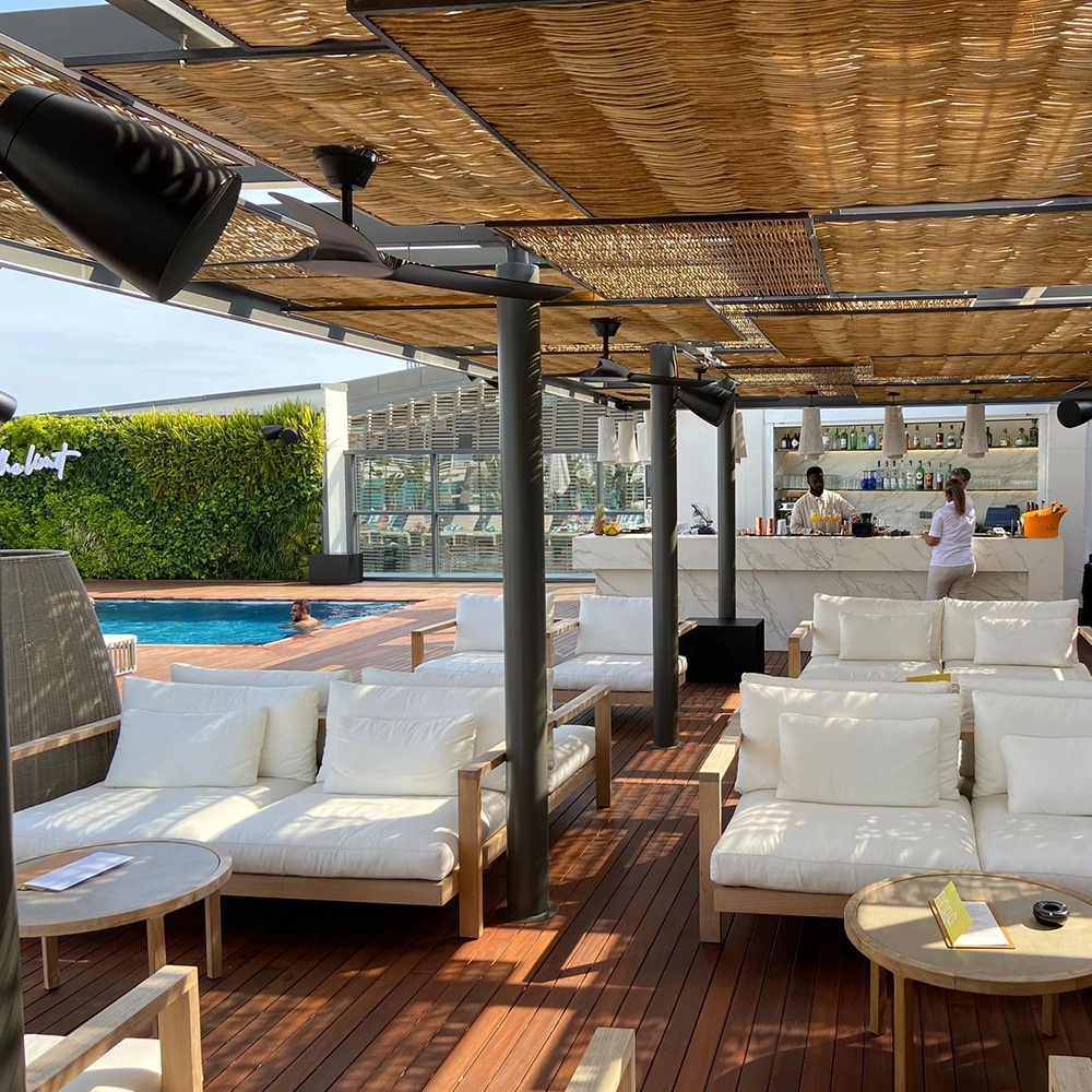 Para dar respuesta a la necesidad del hotel de contar con un sistema de audio mejorado en sus zonas comunes y terraza superior, AUDAC aportó una solución integral a la medida de sus necesidades. Esta incluyó 44 unidades de altavoces ALTI6M/B en color negro, asegurando una reproducción de sonido de alta calidad en las zonas exteriores. Adicionalmente, se instalaron 6 unidades de altavoces de techo CELO5, 12 unidades de CELO6 y 39 unidades de CELO8 en color blanco, para cubrir las distintas zonas con un audio de precisión, sin sobresalir demasiado a simple vista por su fino diseño. Para mejorar la distribución y gestión del audio, se incorporaron 22 unidades de placas de conexión CP45XLFS/B en color negro, 6 unidades de barra de sonido IMEO2/B en color negro.