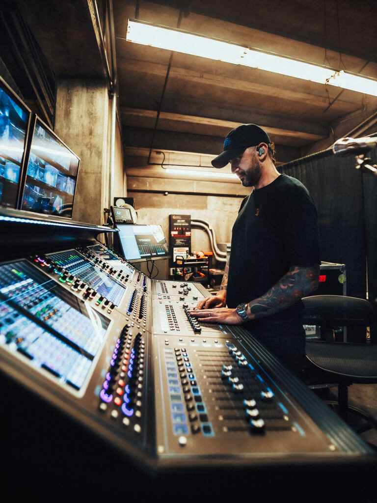 La última gira del artista agotó casi todos los espectáculos e incluyó paradas en The Forum de Los Ángeles, el Madison Square Garden de Nueva York, el State Farm Arena de Atlanta y el Golden 1 Center de Sacramento. Para la etapa de la gira, la consola FOH de Pinzón estaba en un bucle óptico con dos SD-Racks de 56 entradas/24 salidas, cada uno emparejado con una tarjeta de salida AES/EBU, y un SD-Nano Rack, todos completamente cargados con 32 bits. Módulos de E/S. El Quantum338 se equipó además con una tarjeta DMI-DANTE 64@96 para proporcionar envíos de sistema de megafonía digital, mientras que 64 canales provenientes de los racks sirvieron como respaldo analógico. La segunda ranura para tarjetas de la consola alojaba un módulo DMI-WAVES para ejecutar el sistema de respaldo Waves, “ya que ejecuto el principal desde el puerto Waves nativo que viene con la consola”, señala.