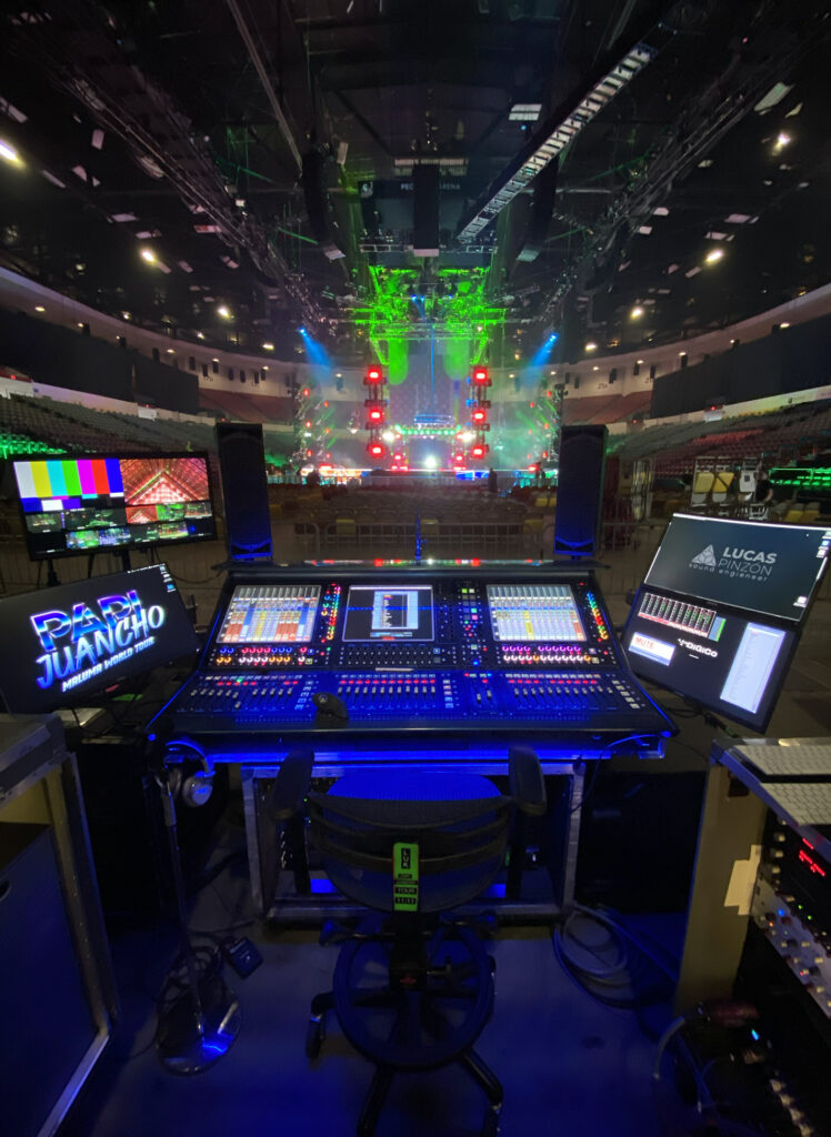 Mientras Pinzón manejaba aproximadamente 90 canales de entrada en la posición FOH cada noche, el ingeniero de monitores German Tarazona trabajaba sus mezclas desde un búnker remoto, dado que el artista usaba un escenario de 360 grados. Con la banda ocupando los cuatro huecos hundidos de un escenario en forma de X, Tarazona utilizó su Quantum338 para crear 12 mezclas IEM estéreo principales para los cantantes y músicos, cuatro mezclas estéreo para los invitados, dos mezclas de repuesto para la banda y ocho canales en un banda de frecuencia diferente para ciudades con mucha congestión de RF, como Dallas, Houston, Phoenix y Los Ángeles.
