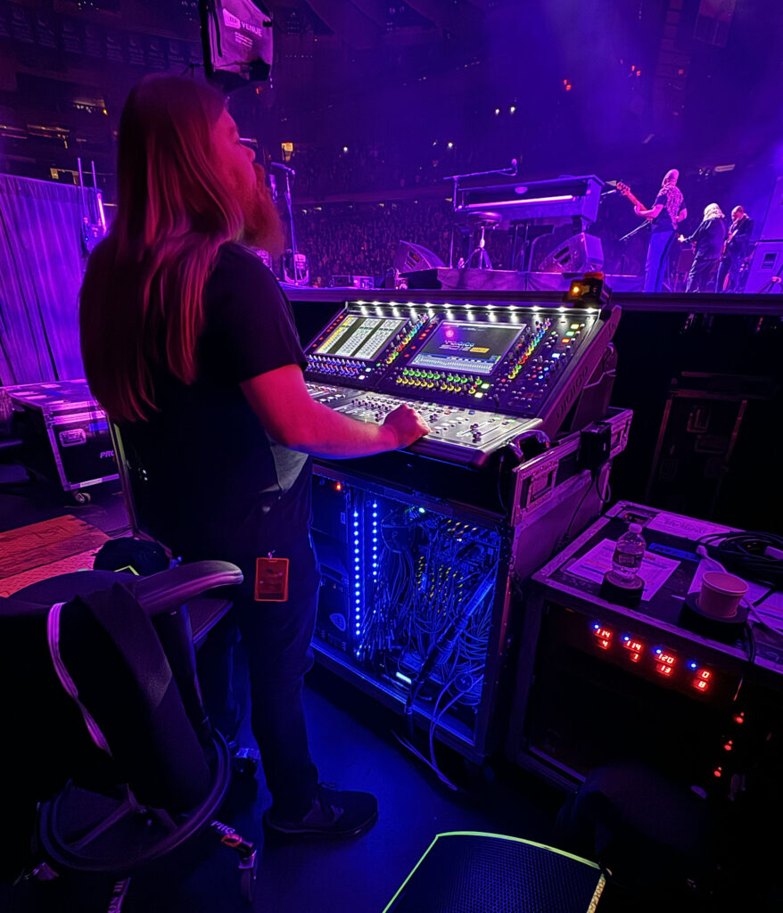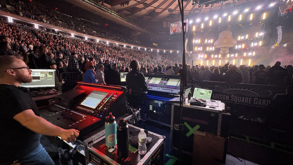 En FOH, Brian Speiser mezcló desde un Quantum3³⁸. A su lado, Chris Bedry manejó un Quantum2²⁵, encargado de multitrackear y enviar una mezcla de respaldo. Otra Quantum3³⁸ se destinó a broadcast, y la SD12‑96 ocupó el puesto de monitores bajo el manejo de Chris Bailey.